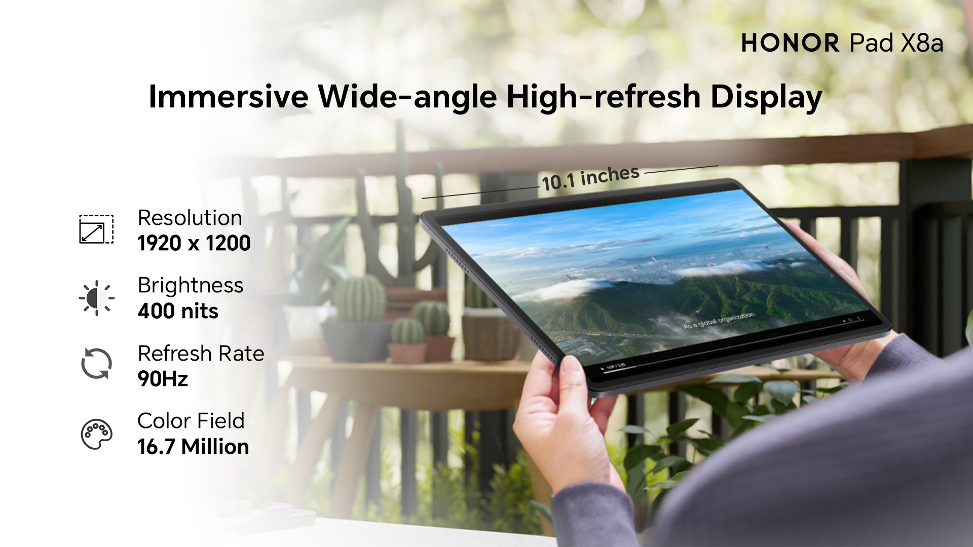 অনার প্যাড এক্স৮এ তে রয়েছে চমকপ্রদ ওয়াইড-অ্যাঙ্গেল এবং চারগুণ চোখ-সুরক্ষা সুবিধা। এর মেটাল বডি ডিজাইন অত্যন্ত স্টাইলিশ এবং হালকা। ওজন মাত্র ৪৯৫ গ্রাম এবং পুরুত্ব মাত্র ৭.২৫ মিমি, আল্টা-স্লিম ডিভাইসটি সহজে বহনযোগ্য। অনার প্যাড এক্স৮এ (৪জিবি+৬৪জিবি) ডিভাইস ১১ ইঞ্চির অনার আই প্রটেকশন ডিসপ্লে সমৃদ্ধ ডিভাইসটির স্ক্রিন-টু-বডি রেশিও ৮৪% এবং ডিসপ্লে রেজুলেশন ১৯২০বাই১২০০, যা স্পষ্ট ও প্রাণবন্ত ভিজ্যুয়াল অভিজ্ঞতা প্রদান করে।