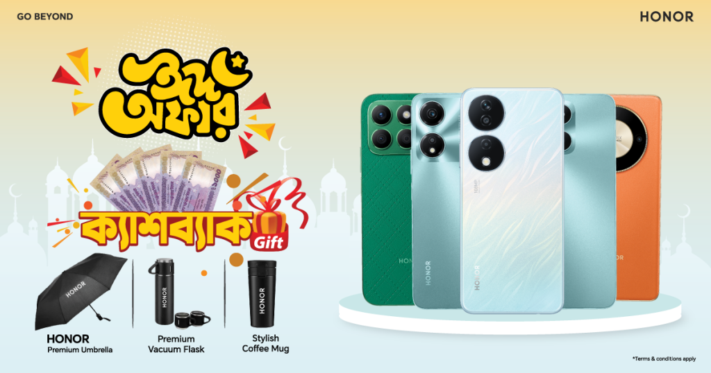 ডিজিটাল বার্তা ডেস্ক : স্মার্টফোন ব্র্যান্ড অনার ঈদুল আজহার খুশিকে আরও বাড়িয়ে দিতে গ্রাহকদের জন্য নিয়ে এসেছে “অবিশ্বাস্য ক্যাশব্যাক অফার”। অনারের নির্দিষ্ট মডেলের স্মার্টফোন কিনলেই জিতে নিতে পারেন আকর্ষণীয় গিফট অথবা নগদ অর্থ সহ অবিশ্বাস্য ক্যাশব্যাক। আরও রয়েছে নির্দিষ্ট প্রোডাক্টে ০% ইএমআই সুবিধাসহ গ্রামীনফোন, রবি ও এয়ারটেল গ্রাহকদের জন্য ফ্রি ইন্টারনেট।