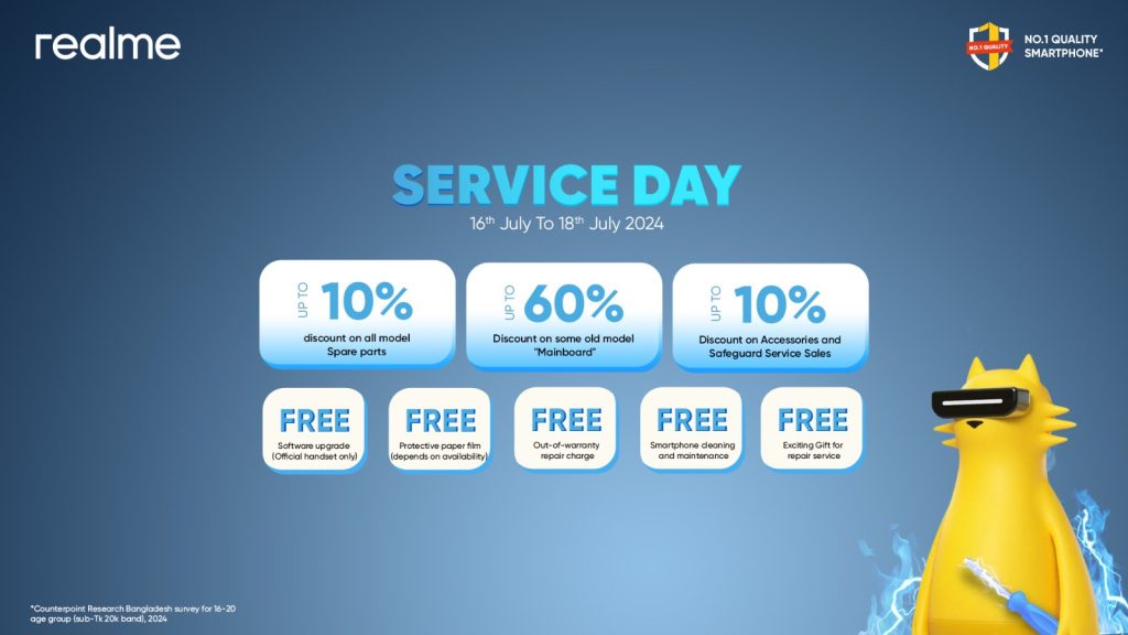 সার্ভিস ডে চলাকালীন, রিয়েলমি ফোন ব্যবহারকারীরা সকল ধরনের স্পেয়ার পার্টস কেনায় পাচ্ছেন ১০% পর্যন্ত ডিসকাউন্ট, কিছু পুরনো মডেলের মেইনবোর্ড ক্রয়ের ক্ষেত্রে ডিসকাউন্ট পাচ্ছেন ৬০% পর্যন্ত, এবং ফোনের আনুষঙ্গিক যন্ত্রপাতি কেনায় ছাড় পাচ্ছেন ১০% পর্যন্ত।