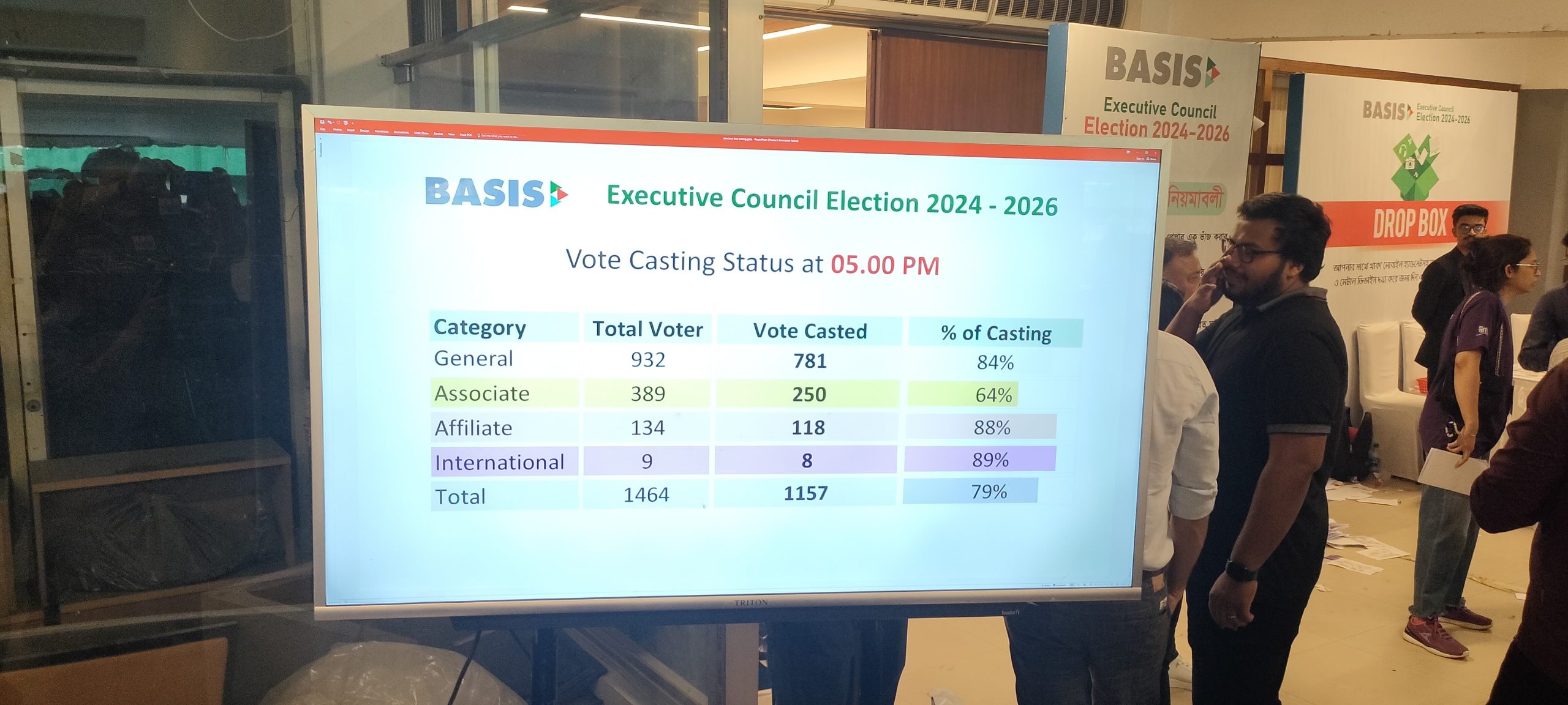 চার ক্যাটাগরির মোট ১৪৬৪ ভোটারের মধ্যে ভোটাধিকার প্রয়োগ করেছেন ১১৫৭ জন। এর মধ্যে সাধারণ ক্যা্টউৎসব গরিতে ৭৮১, সহযোগিতে ২৫০, অ্যাফিলিয়েটে ১১৮ এবং আন্তর্জাতিকে ৮৯ শতাংশ ভোট পড়েছে।